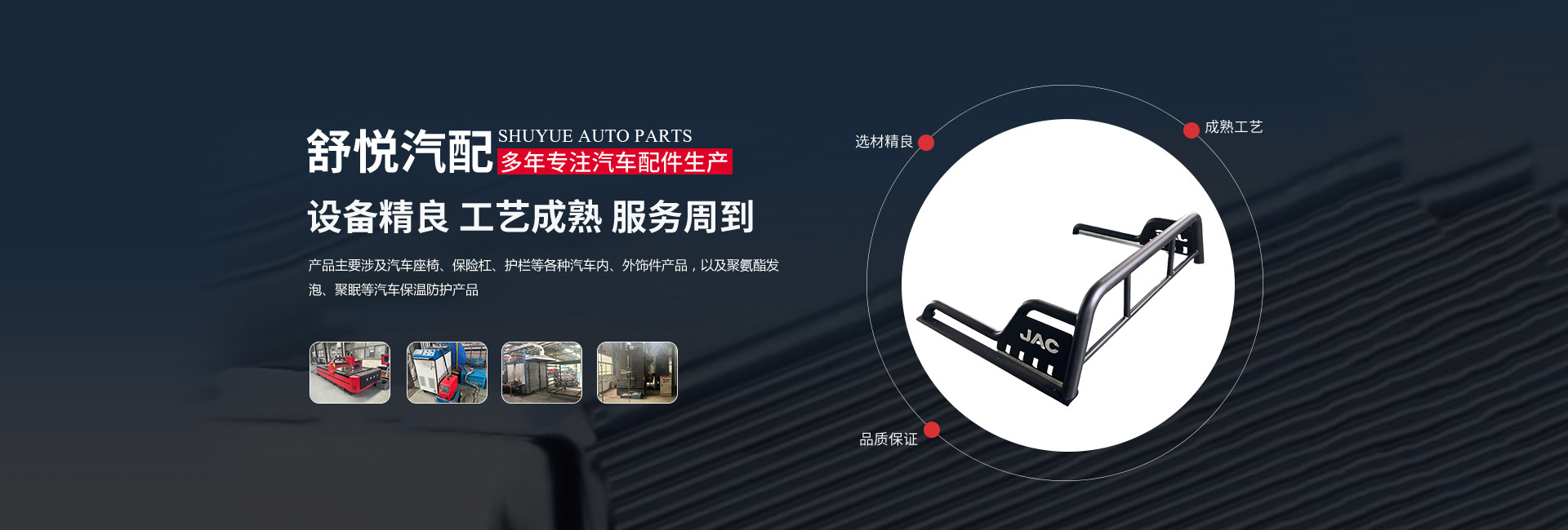 揚州舒悅汽配有限公司經(jīng)過多年的穩(wěn)定發(fā)展,業(yè)績一直蒸蒸日上。公司產(chǎn)品主要涉及汽車座椅、保險杠、護欄等各種汽車內(nèi)、外飾件產(chǎn)品,以及聚氨酯發(fā)泡、聚脲等汽車保溫防護產(chǎn)品。其主要是為江淮、金龍,奇瑞等公司服務(wù),已連續(xù)多年成為江淮、金龍等公司的A級供應(yīng)商。        公司成立于1997年,現(xiàn)坐落于揚州市儀征劉集盤古工業(yè)集中區(qū)202號,公司占地面積26640平 方米,廠房建筑面積18512平方米。公司擁有先進的制造設(shè)備、可靠的生產(chǎn)工藝、完善的檢測手段和科學(xué)的管理,在售前和售后服務(wù)中做到快速反應(yīng),應(yīng)急應(yīng)變,為客戶提供優(yōu)良產(chǎn)品和滿意服務(wù)。公司的產(chǎn)品開發(fā)能力和生產(chǎn)規(guī)模在同行業(yè)中處于前列的地位。        揚州舒悅?cè)吮小罢\信雙嬴”的原則,發(fā)揚“誠信、務(wù)實、創(chuàng)新、貢獻”的企業(yè)精神,恪守“顧客至上”的經(jīng)營宗旨,致精從業(yè),不斷引進新技術(shù)、新材料。以優(yōu)良的產(chǎn)品、合理的價格和周到的服務(wù)參與市場競爭。公司愿與國內(nèi)外朋友建立真誠的合作伙伴關(guān)系,攜手共創(chuàng)輝煌!